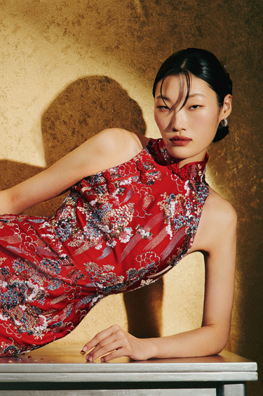 The Jillian embroidered gown is crafted from embroidered chrysanthemum satin fabric. The halter neck cheongsam featuring delicate piping and hand-tied pipa knots accents. This floor-length design combines sophisticated styling with a modern back slit.