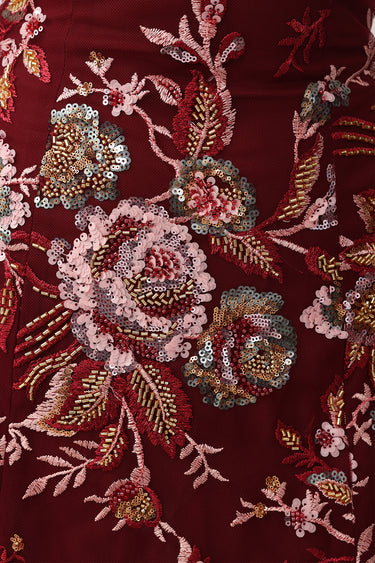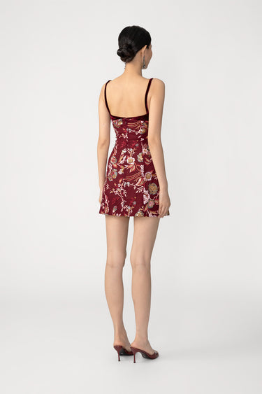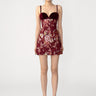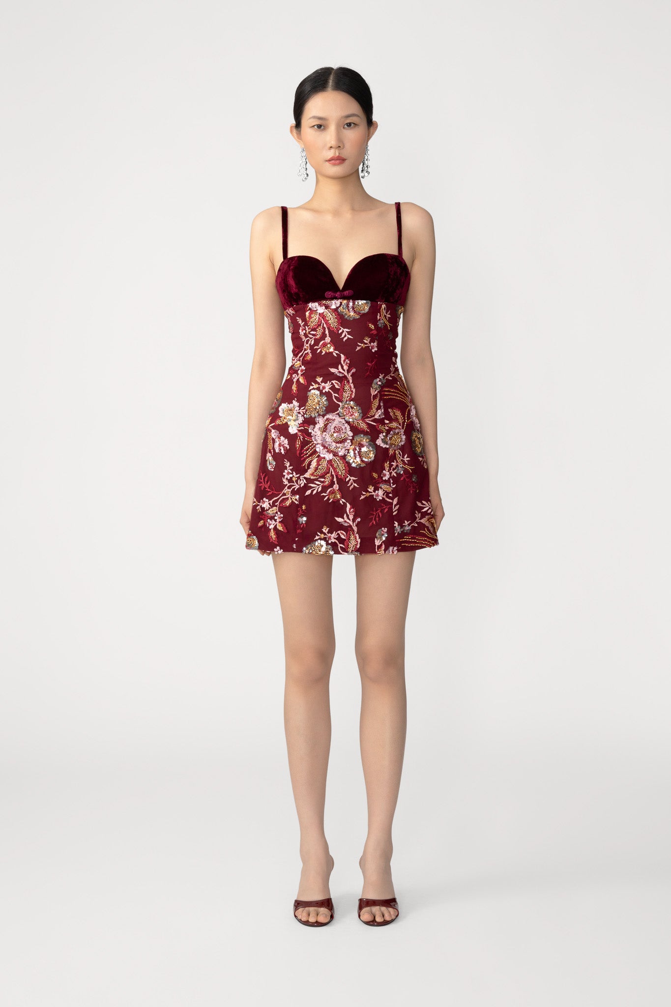 The Aura Dress is an A-line mini silhouette adorned with beading and shimmering sequins in a striking floral-inspired motif. Featuring a sculpted sweetheart neckline, the velvet bust is accented by a single signature hand-tied pipa knot for a playful touch.