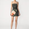 The Piper Dress is a fitted printed satin mini with adjustable shoulder straps featuring an original chrysanthemum design.