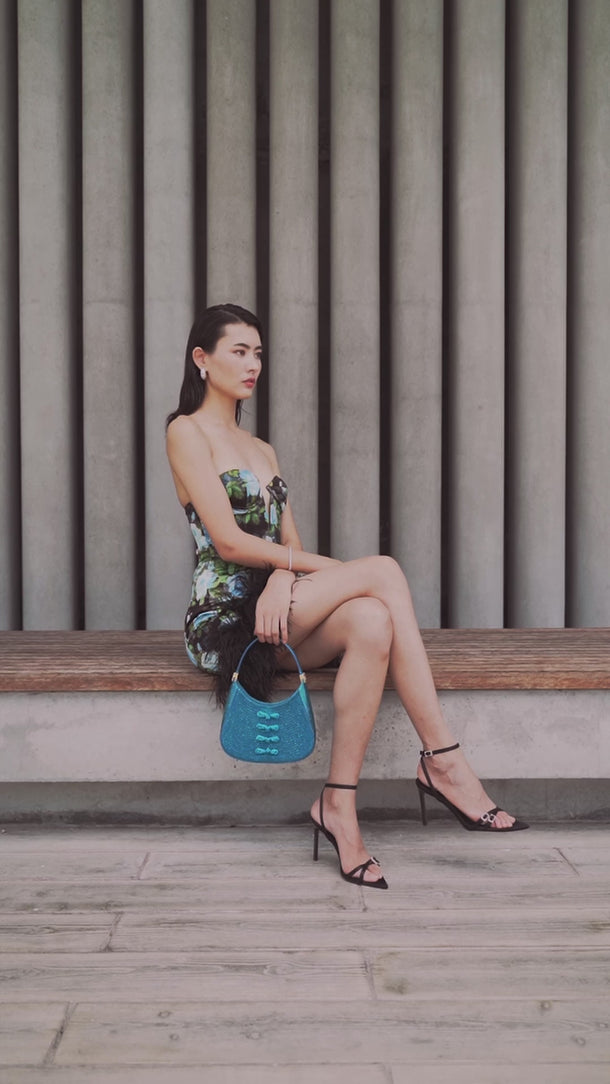Our pipa-shaped mini bag crafted from deluxe satin with a leather base and handle. Adorned with premium tone-on-tone color crystals and our signature hand-tied pipa knot buttons. Adding that extra bit of sparkle to complete the look. The mini sau is the perfect size to carry what you need while looking chic on any occasion.