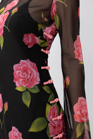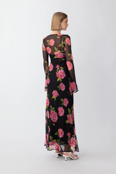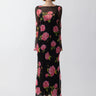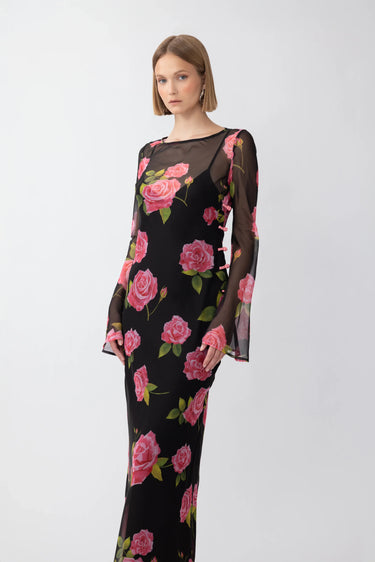 Chiffon maxi dress with long sleeves over a removable slip featuring our signature rose print pattern