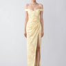 Off-shoulder satin maxi dress with a thigh-high slit featuring our signature hand-tied pipa knot button detail