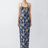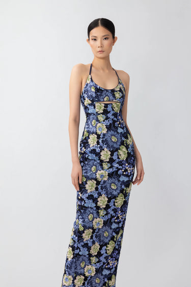 Embellished maxi dress with a halter neckline, small cutout on the bust and a back slit