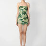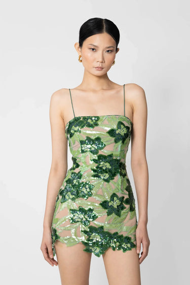 Embellished mini dress with straps and scalloped hem featuring a medley of two-tone floral sequins over nude chiffon lining