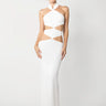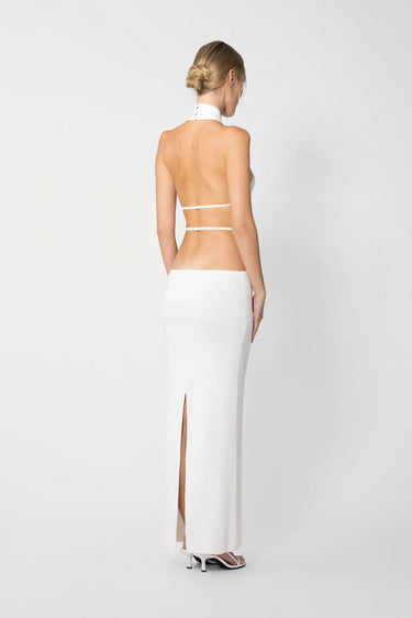 Bodycon cutout midi dress in viscose knit with open back and modified mandarin collar