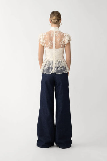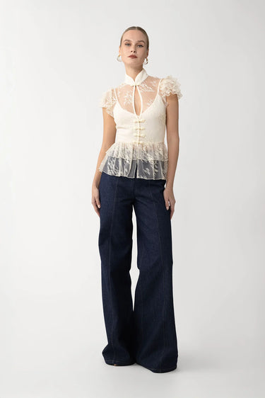 The Roux Top is a romantic lace piece designed with a mandarin collar, hand-tied pipa knots, and a front keyhole cut-out. It comes with a matching lining for added coverage. Pair it with the Brooklyn Denim Pant for an elevated casual look.