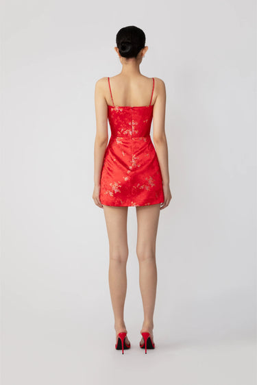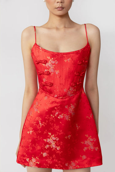Fit & flare jacquard mini dress with a fully-boned corset top and an A-line skirt featuring our signature hand-tied pipa knot detail