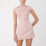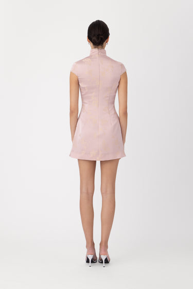 The Cara dress is crafted from blush pink satin jacquard, featuring a cheongsam design and a structured mandarin collar. Finished with cap sleeves and a delicate pearl trim along the collar and seams, the Cara dress is a flirty rendition of the classic cheongsam.