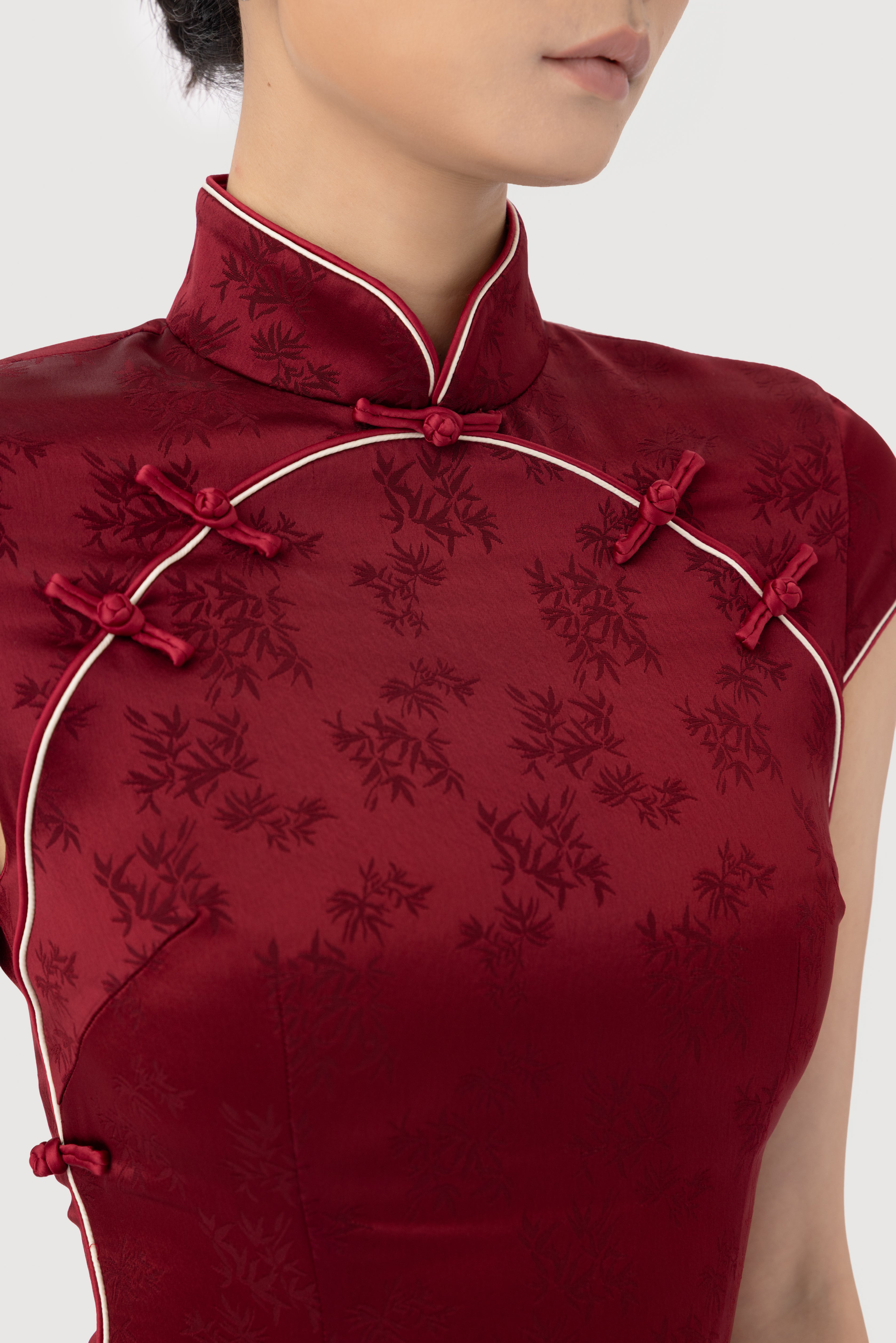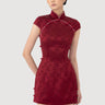 Crafted from luxurious satin jacquard, featuring cap sleeves and a mini silhouette design. Delicate double satin piping and hand-tied knot buttons add refined detail, while a side slit introduces a contemporary finish. The Ren dress is a flirty rendition of the classic cheongsam.