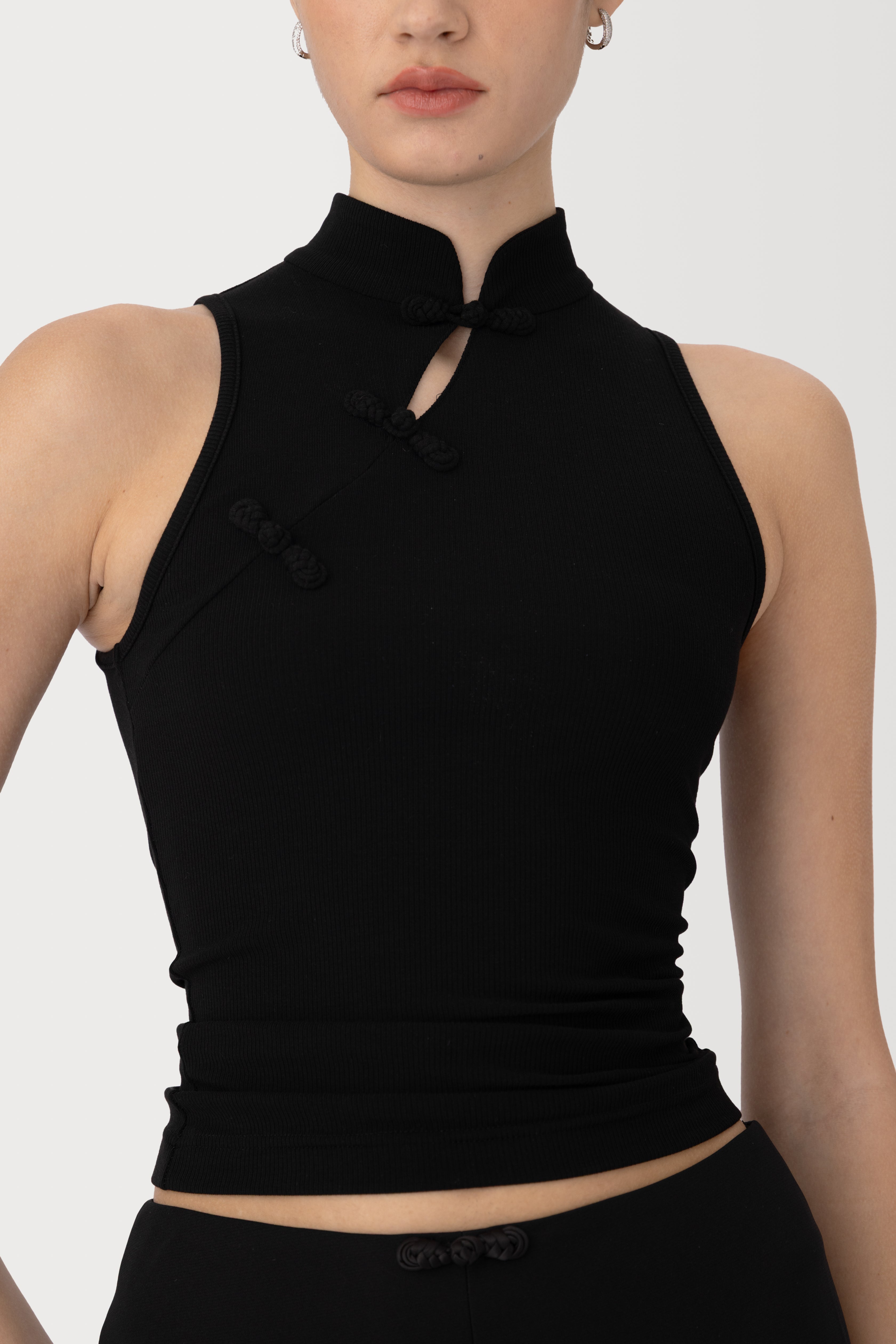 The Tao knit top is a cheongsam tank top crafted from comfortable cotton rib fabric. It features a mandarin collar and a keyhole back opening for a modern aesthetic, with hand-tied pipa knot details adding a distinctive flare. This versatile top serves as a daily essential when paired with the Mason denim pant, or can be dressed up with the Astrid pant.
