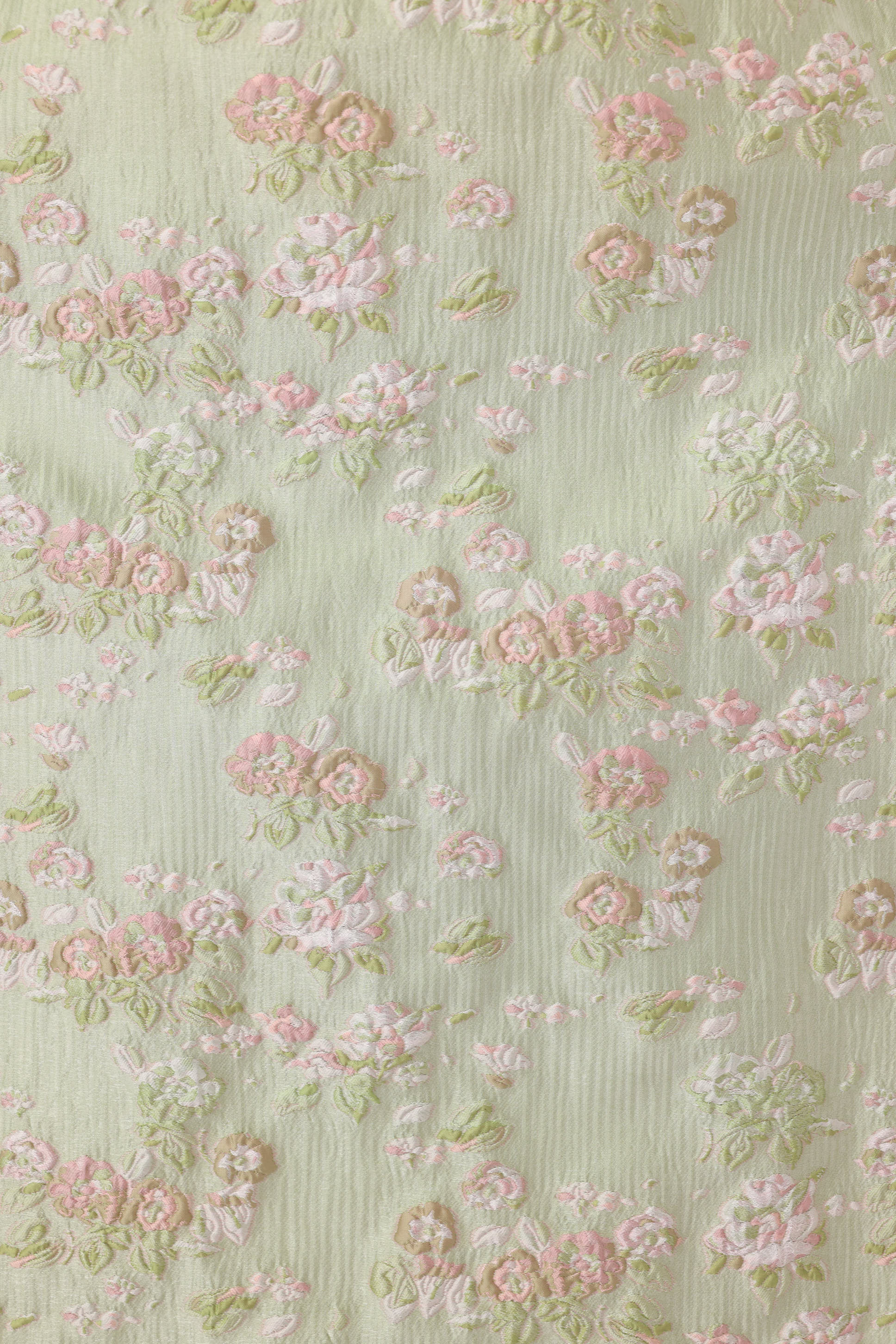 The Alice brocade dress is a midi piece featuring a sharp fitted waist and a clean square neckline, balanced by a sleek back slit for ease of movement. The contrast color hand-tied pipa knots provides a distinctive touch.