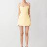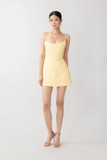 Tweed mini dress with a fully boned corset top featuring our hand-tied pipa knot button detail