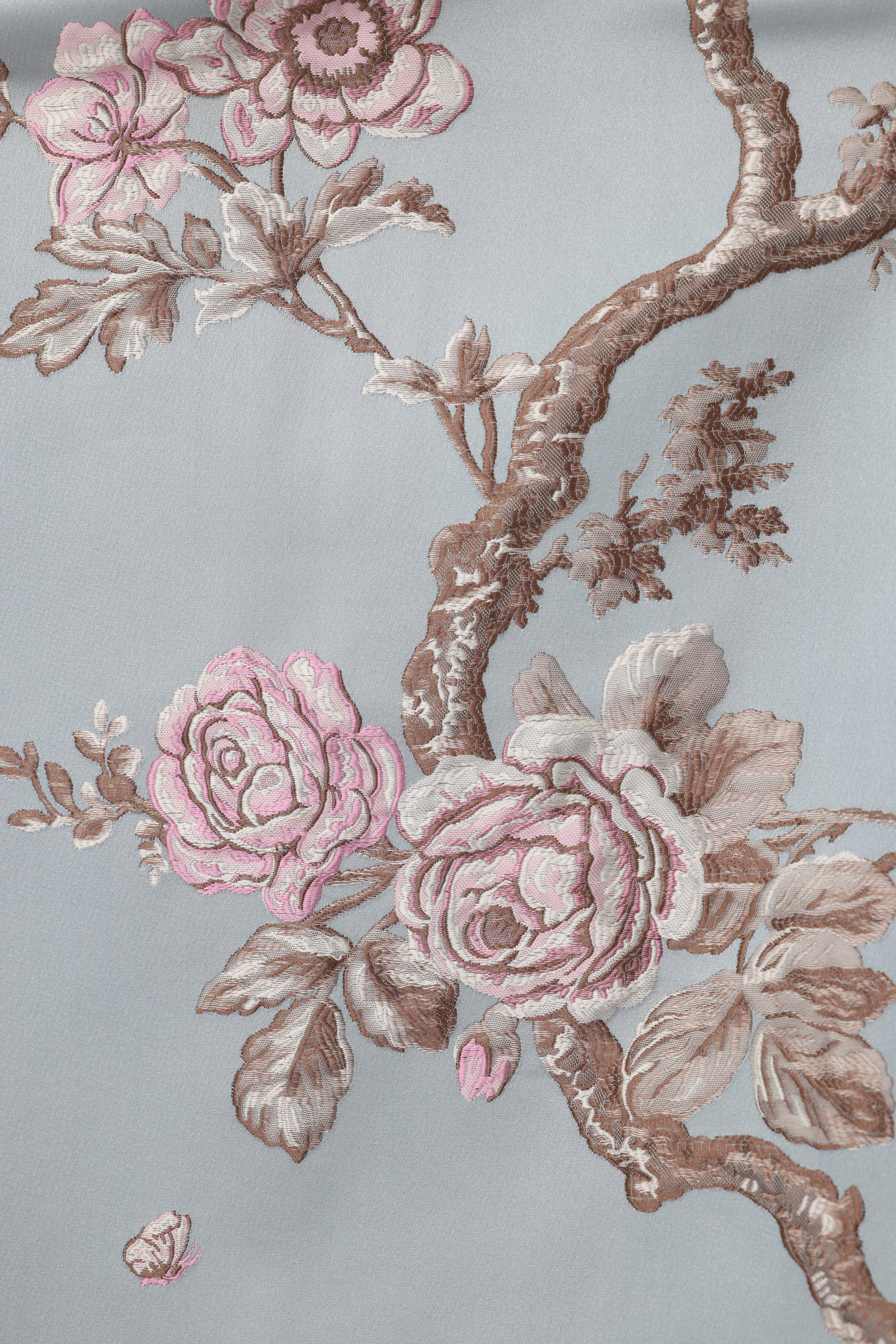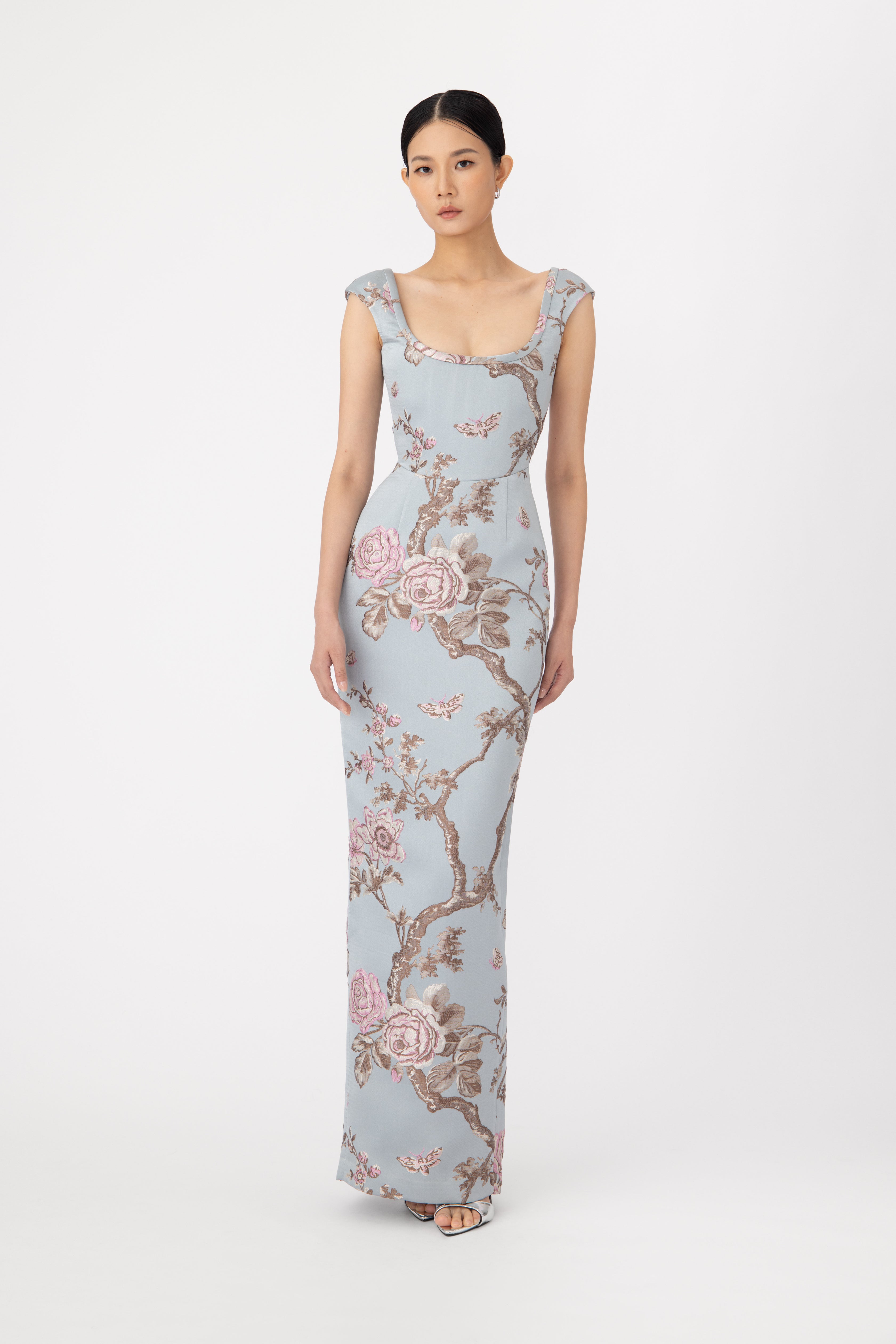 The Brooke brocade gown is a floor-length design in luxurious peony brocade fabric. It features a scoop neckline and a built-in structured corset for a sculpted fit. A front curved waistline defines the silhouette, while a back slit completes the sophisticated look.