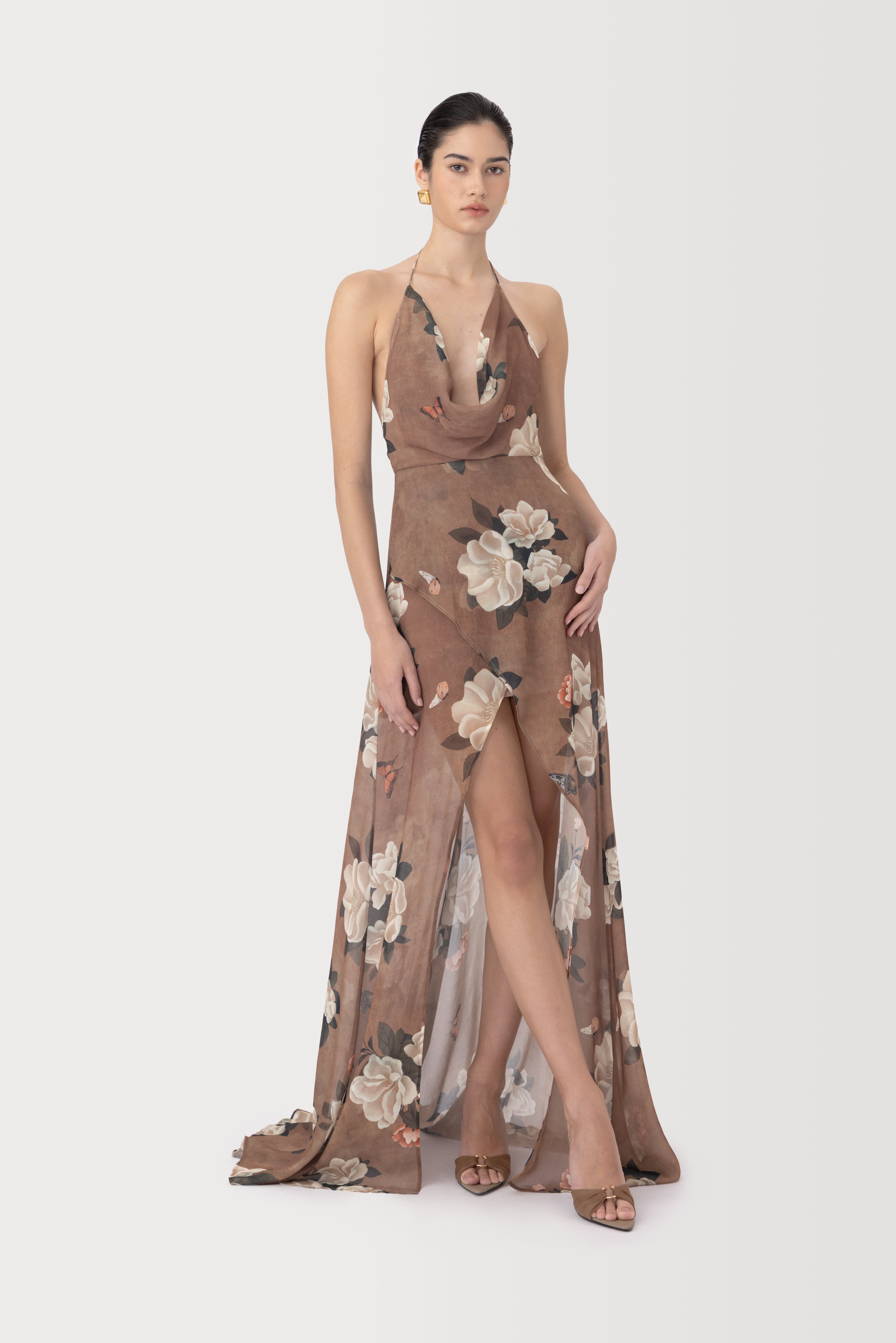 Crafted from soft chiffon, the Cairo dress maxi piece featuring an exclusive in-house hand-painted magnolia print. Designed with a deep cowl drapes neckline and a sleek open back. The flowy silhouette is cut short in the front and extends into a longer length at the back. Layer it with the Etta corset for a complete ensemble.