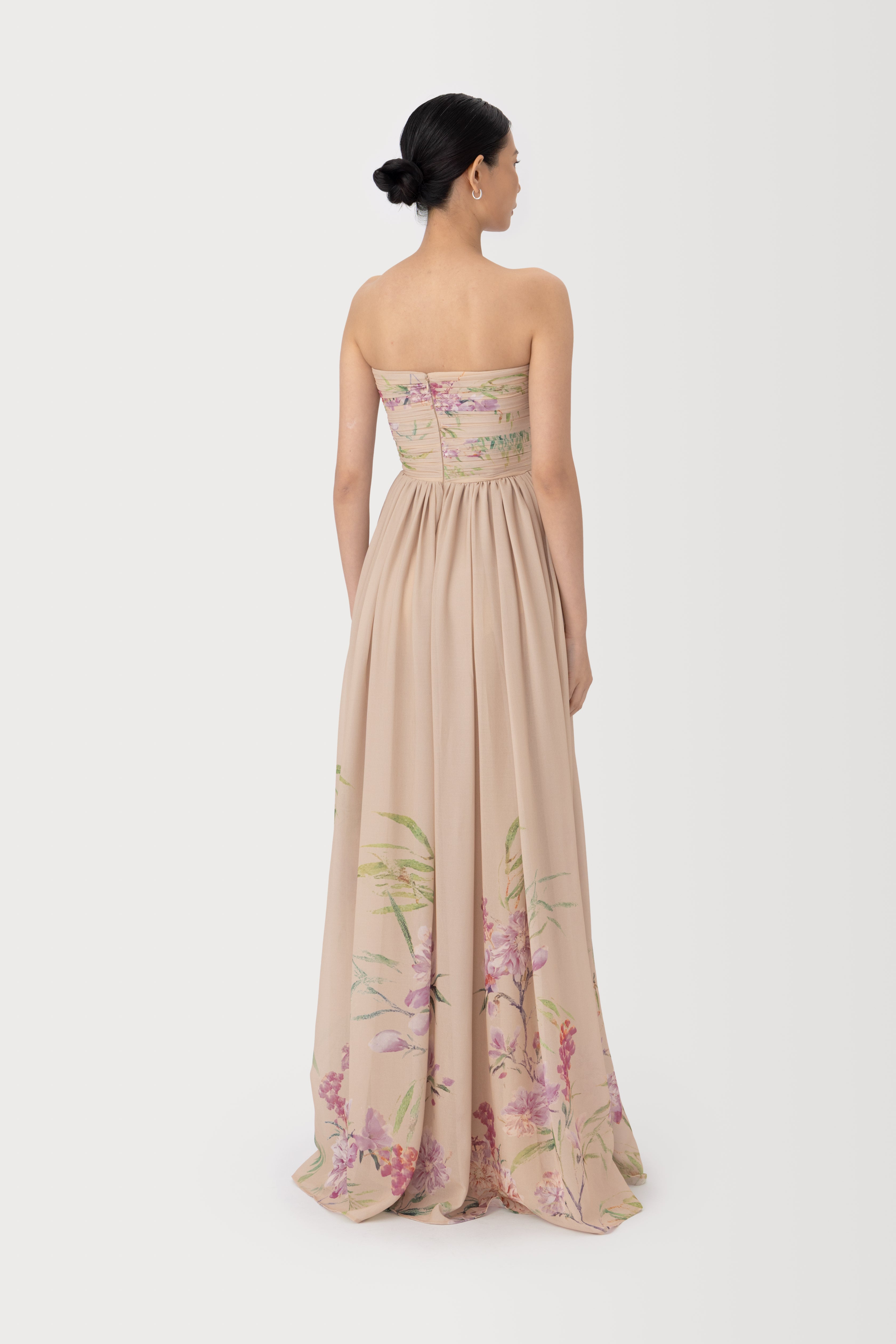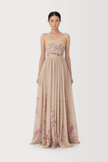 The Camille dress is a strapless maxi featuring an exclusive, handcrafted carnation print design. The ruched bodice flows into a fitted waist, while the skirt flares into an airy silhouette.