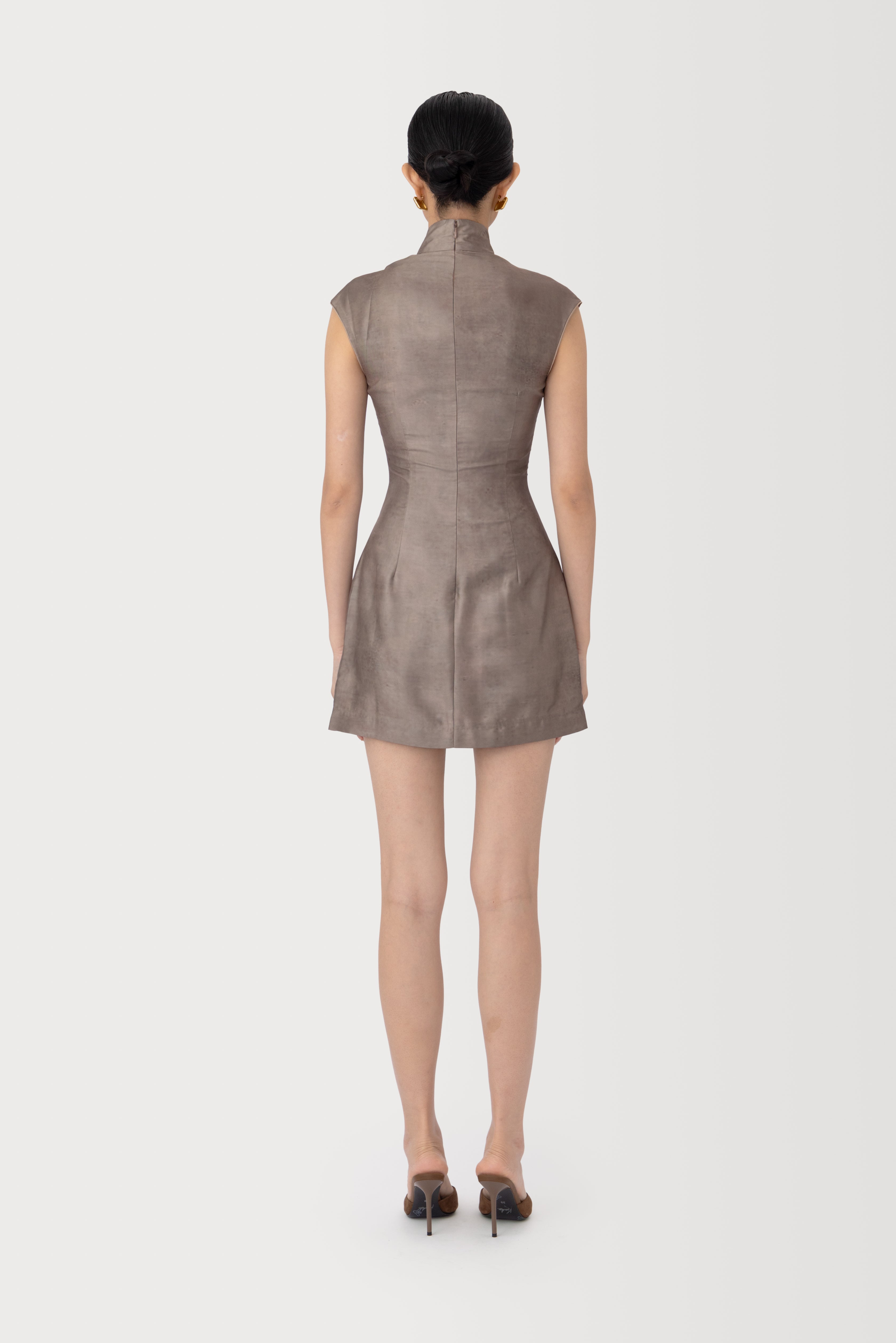 The Devon dress is a mini cheongsam showcasing a unique, handcrafted magnolia print design. It features a distinctive cheongsam opening with mandarin collar, accented with a modern front slit.