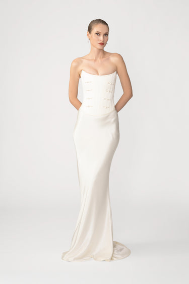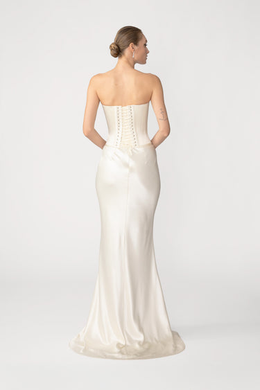 The Dolly Skirt is a classic bias-cut design that elongates the body and drapes fluidly in glossy satin, enhancing natural lines and curves. This piece brings sophisticated, understated elegance with a sensual touch.