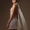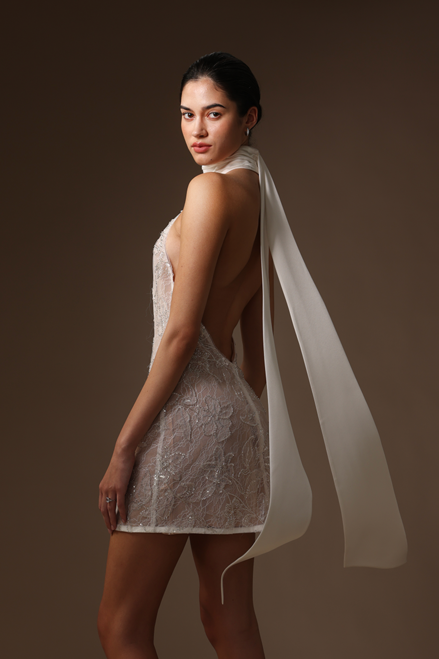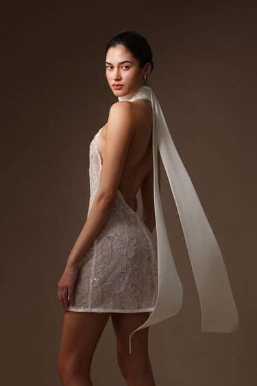 Featuring a scarf-draped satin halter neck and an alluring open back, the Donna lace is crafted from silver-beaded lace with a soft chiffon lining in a mini length.