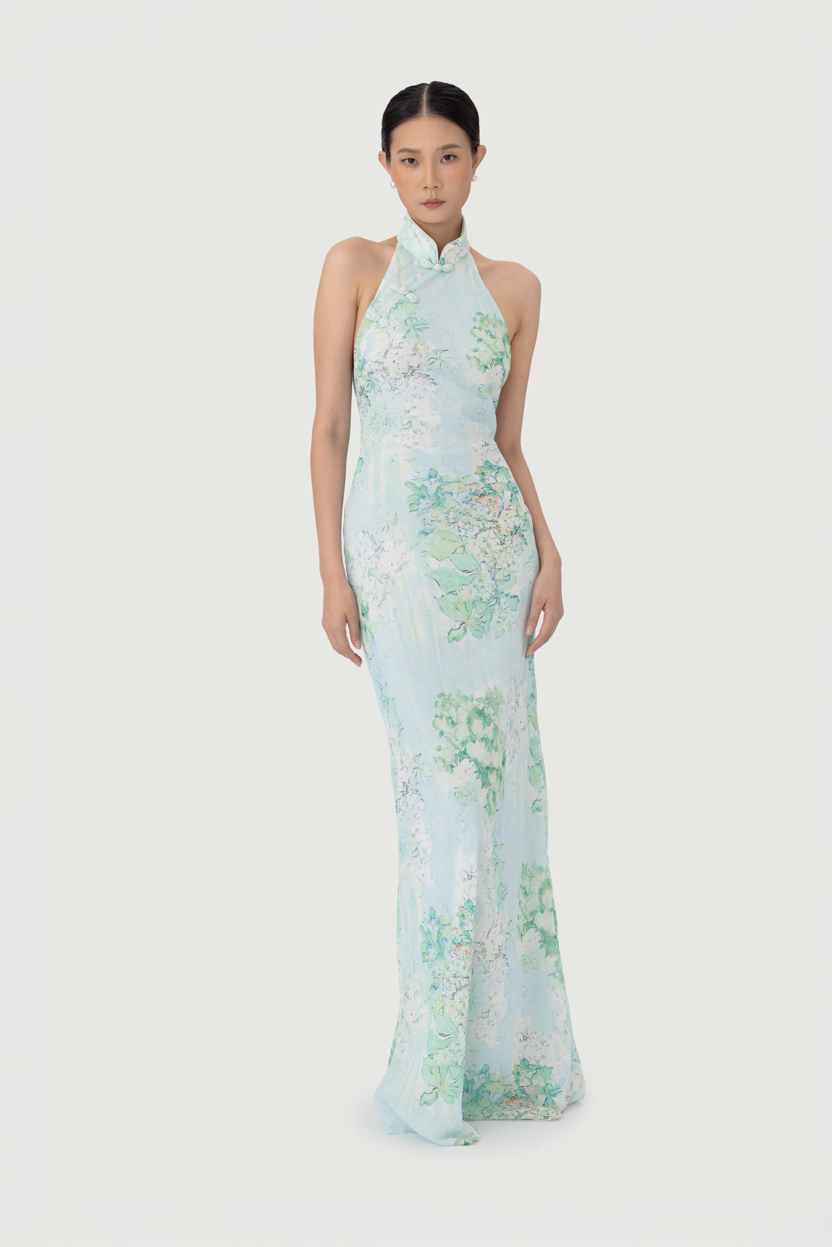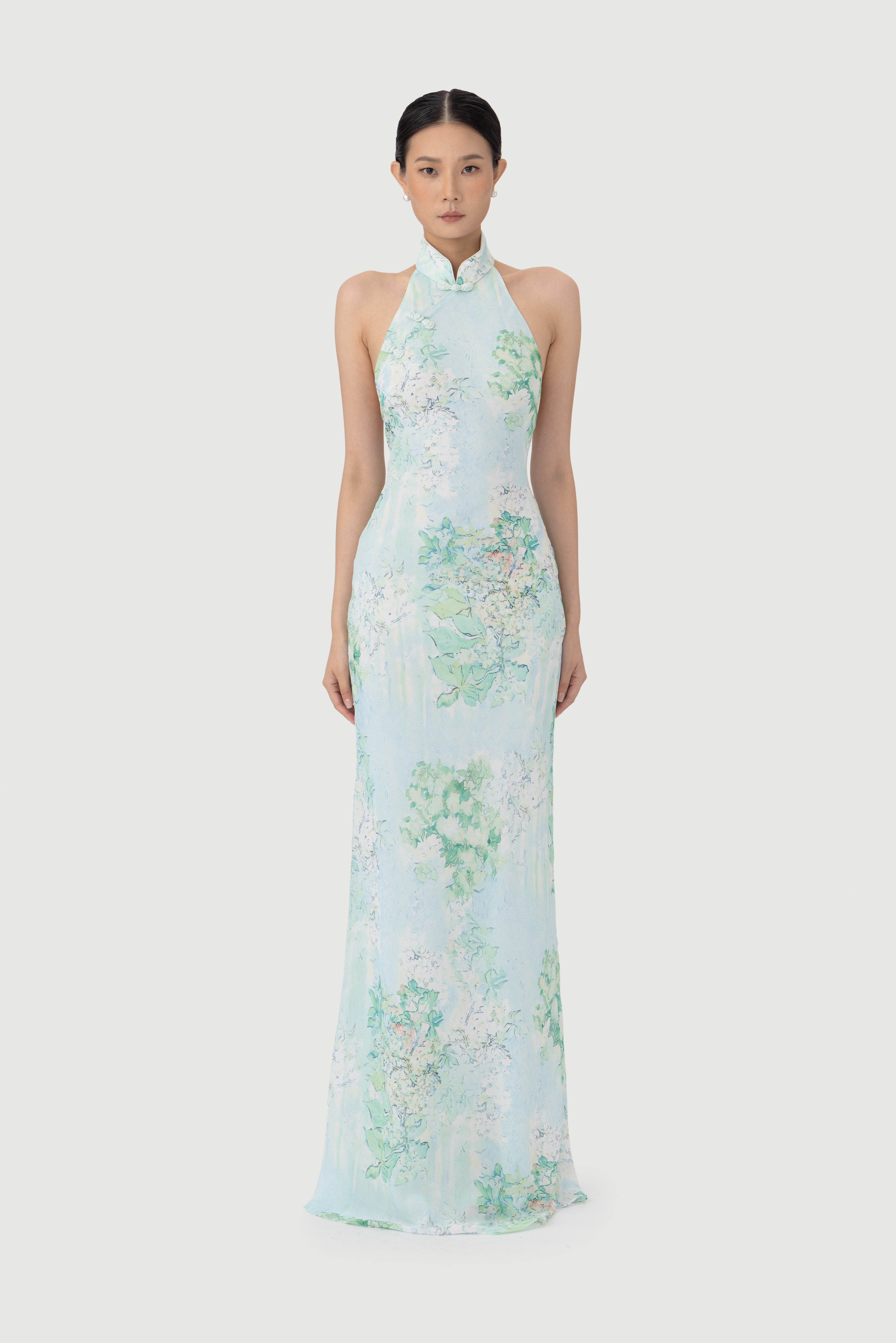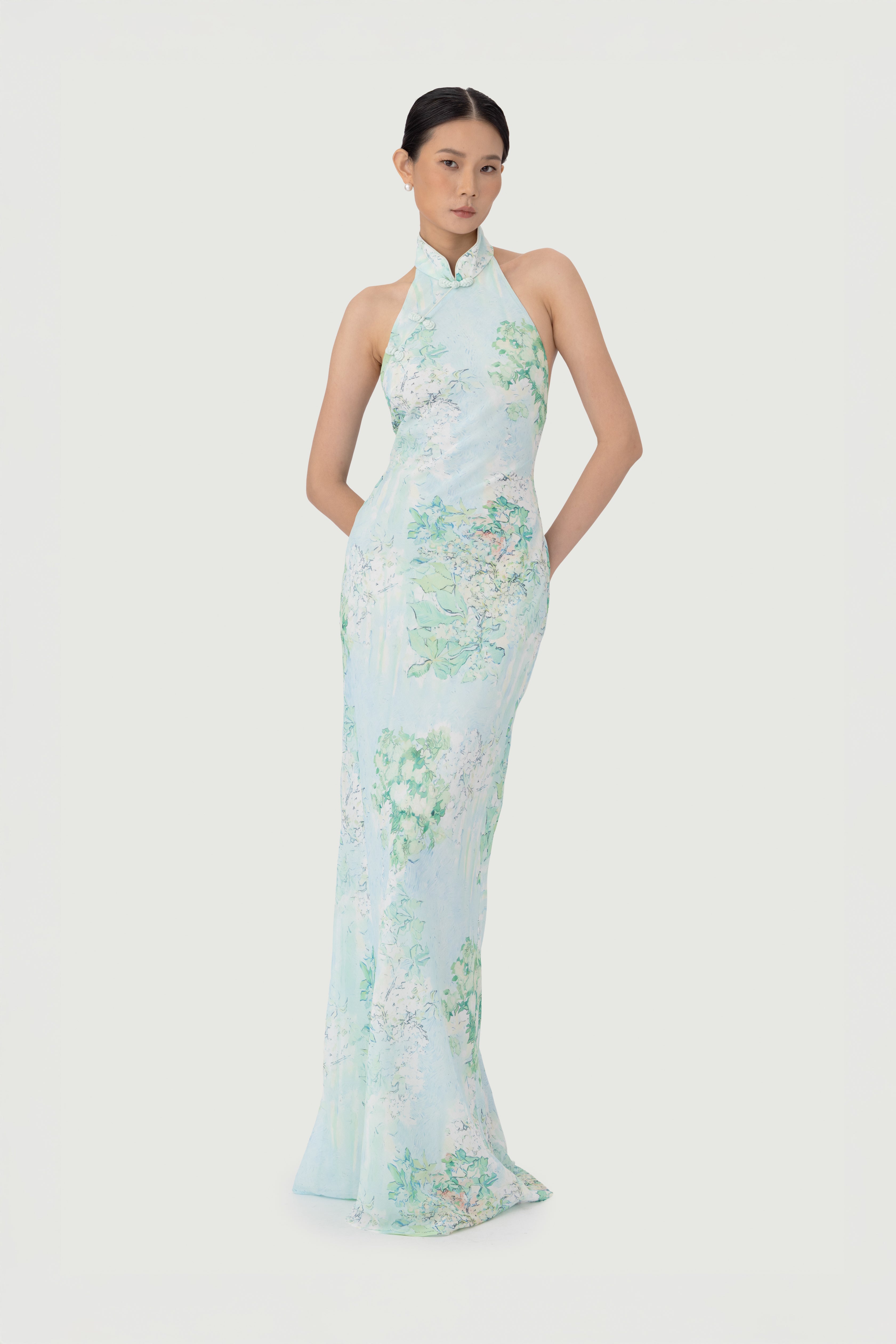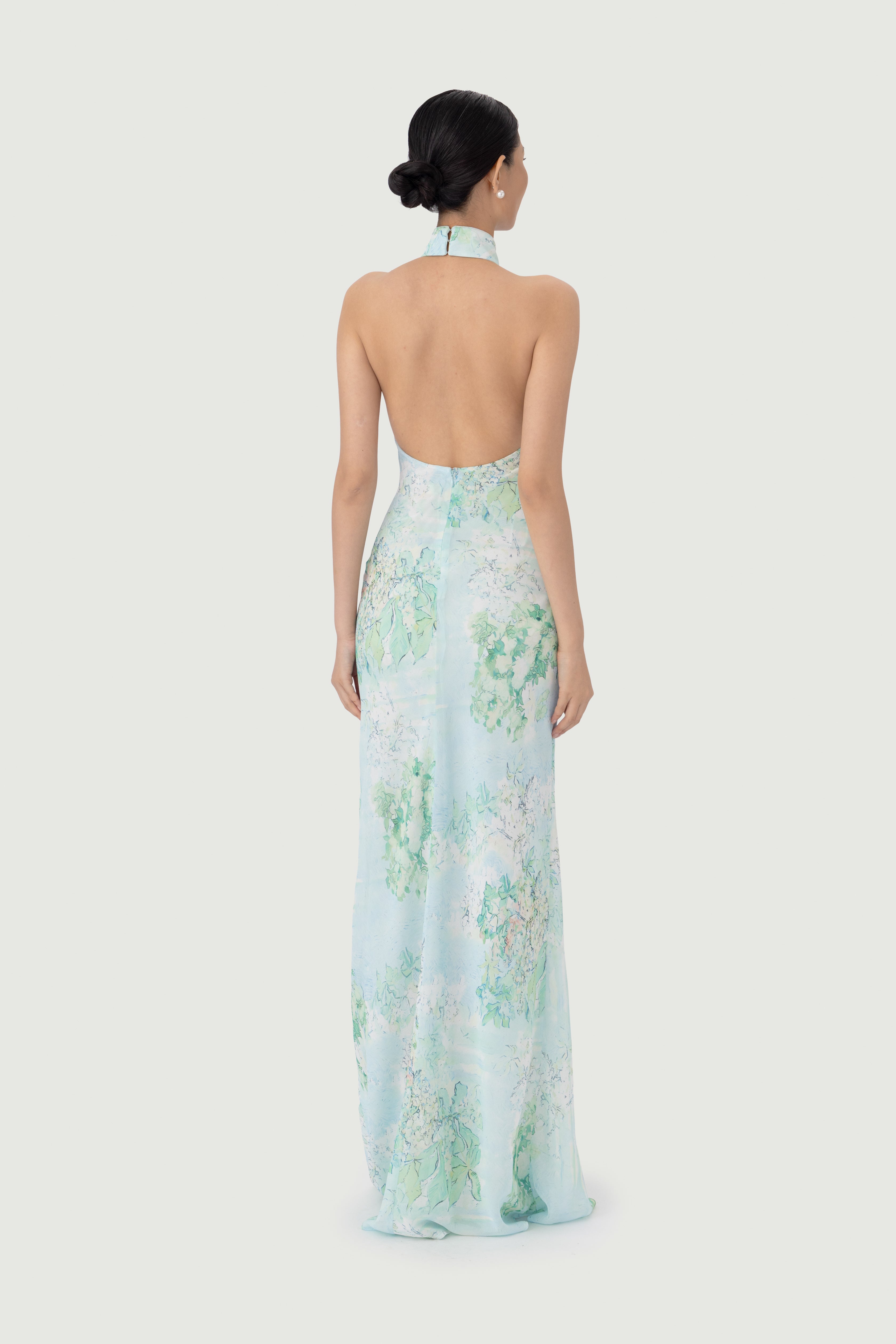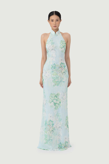 The Gillian chiffon dress features an exclusive, handcrafted carnation print design. A sleek halter neckline flows into a dramatic open back. Hand-tied pipa knot and piping details accentuate the design.