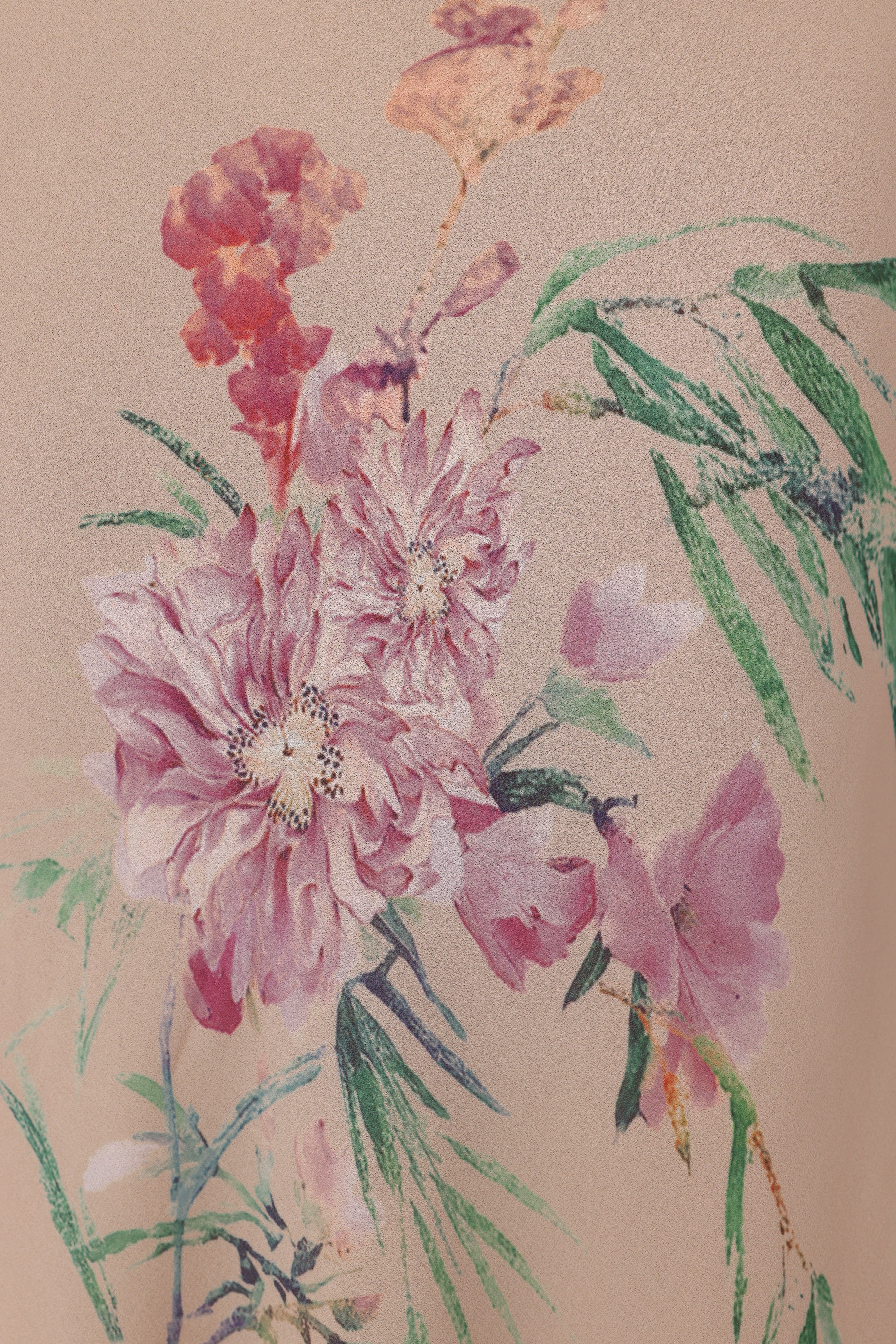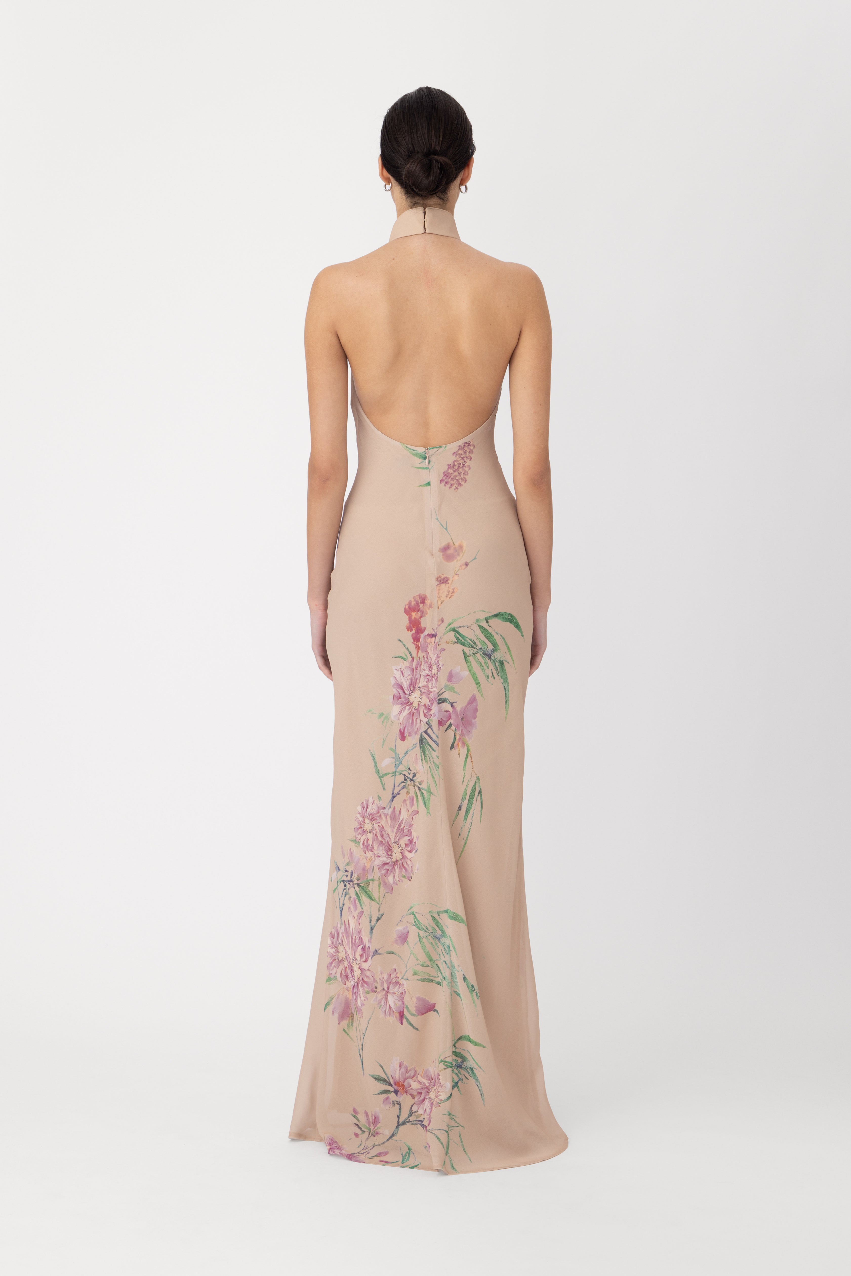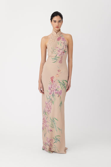 The Gillian chiffon dress features an exclusive, handcrafted carnation print design. A sleek halter neckline flows into a dramatic open back. Hand-tied pipa knot and piping details accentuate the design.