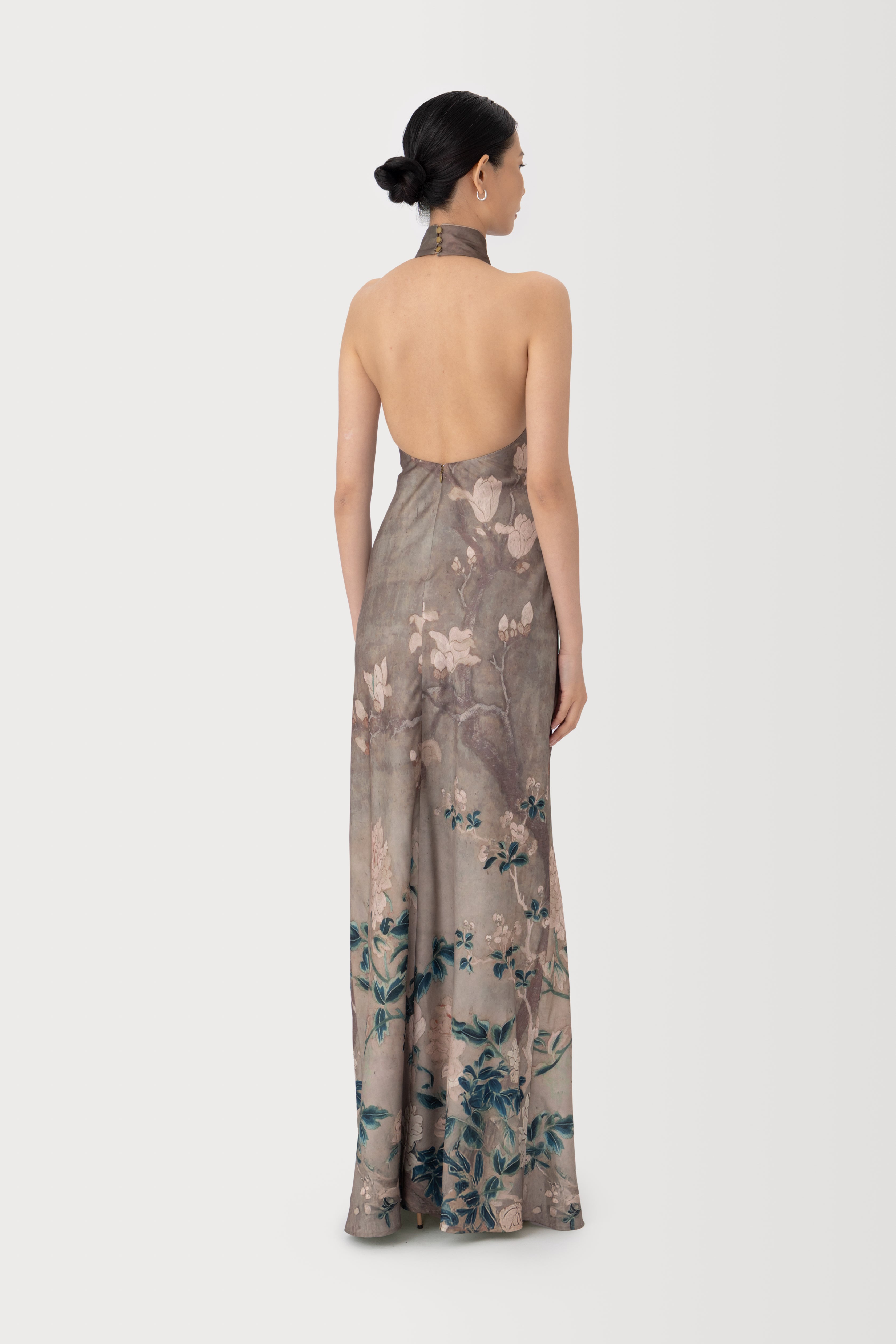 The Gillian satin dress is a floor-length cheongsam inspired piece. Featuring a distinctive, handcrafted magnolia print design. A sleek halter neckline flows into a dramatic open back. Hand-tied pipa knot details and satin piping accentuate the design.