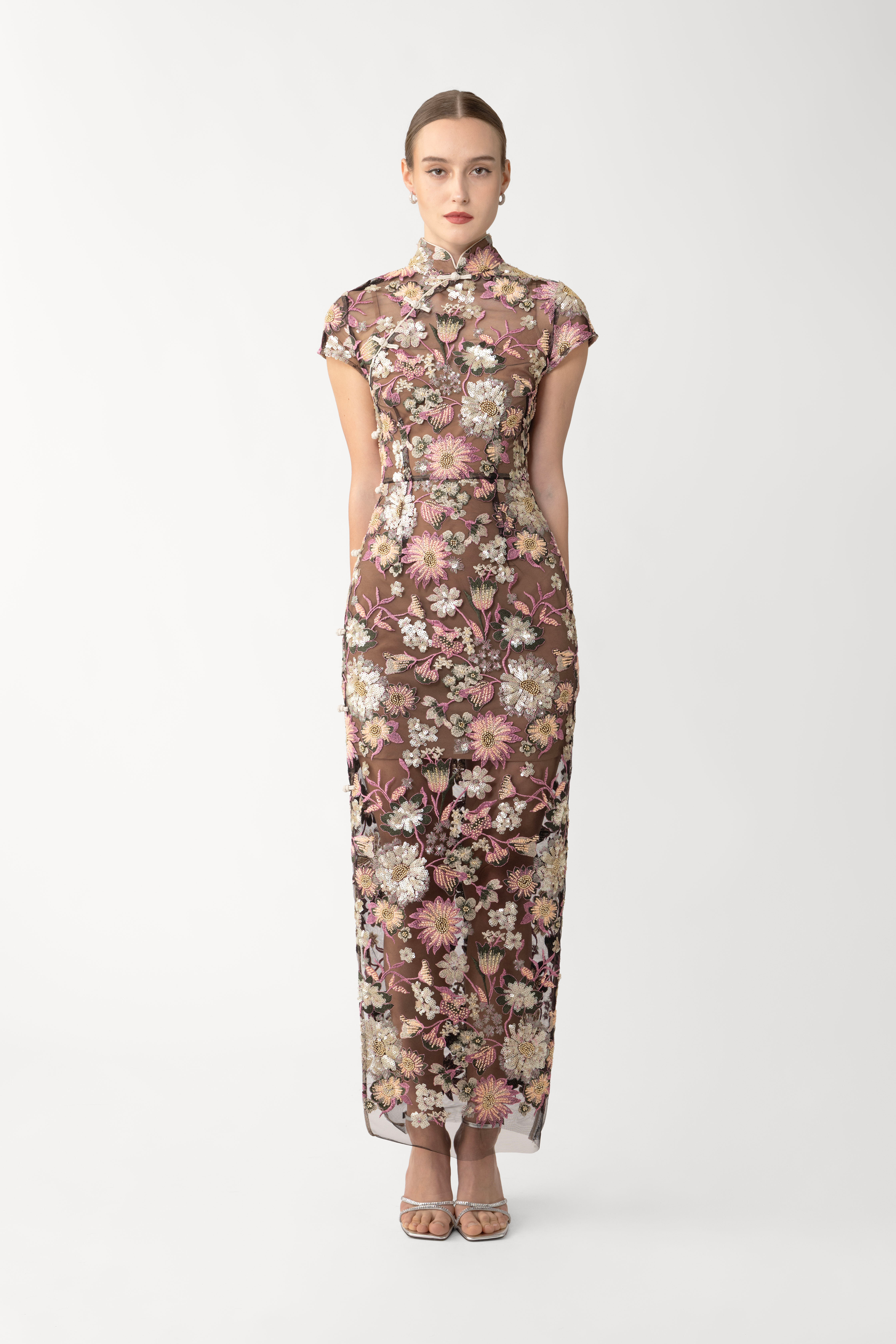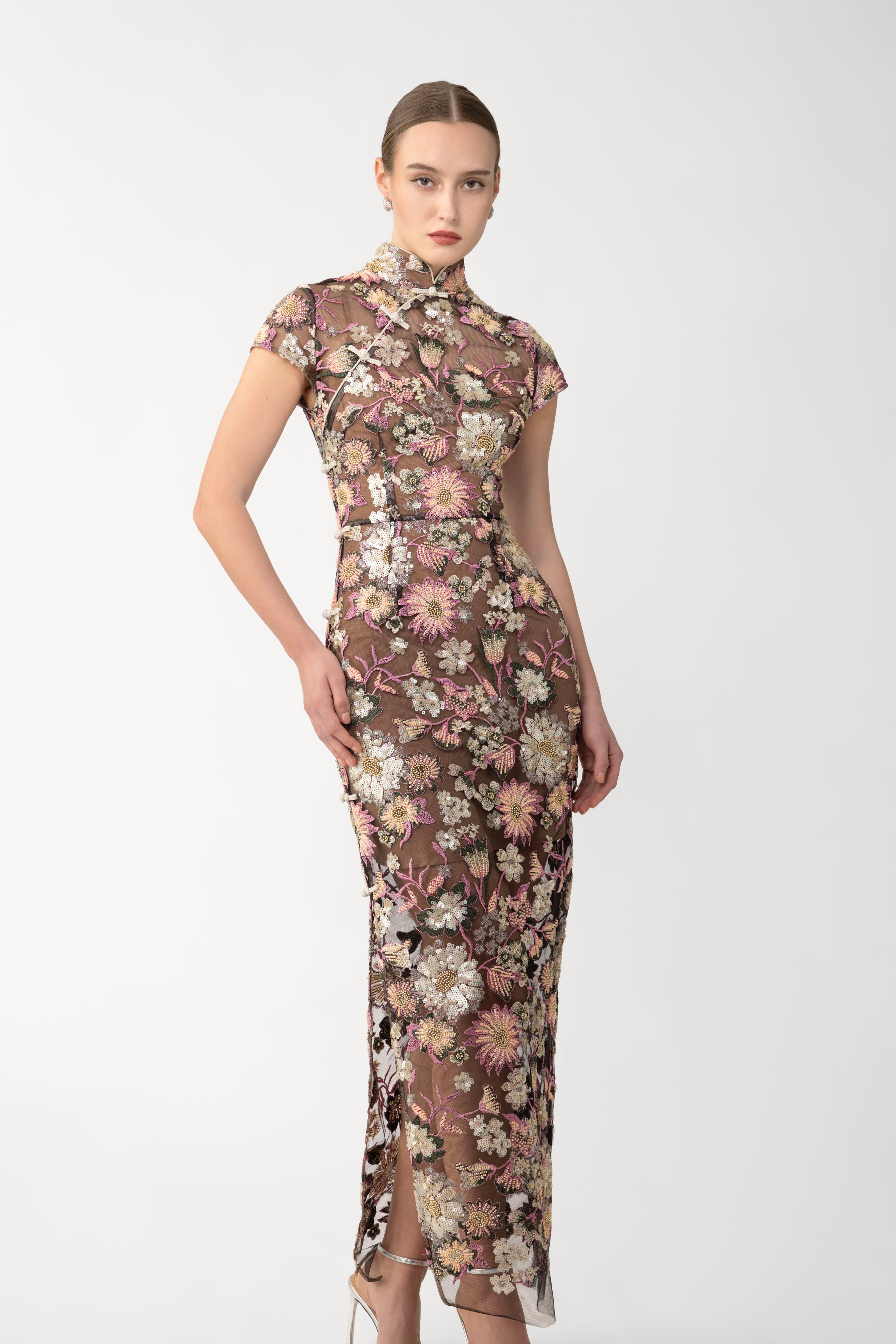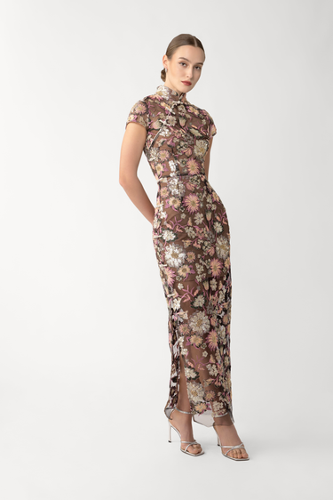 The Gina Dress is an embellished modern cheongsam with floral sequins, delicate beading, and signature pipa knots. It comes with a separate slip dress for versatile styling and added coverage.