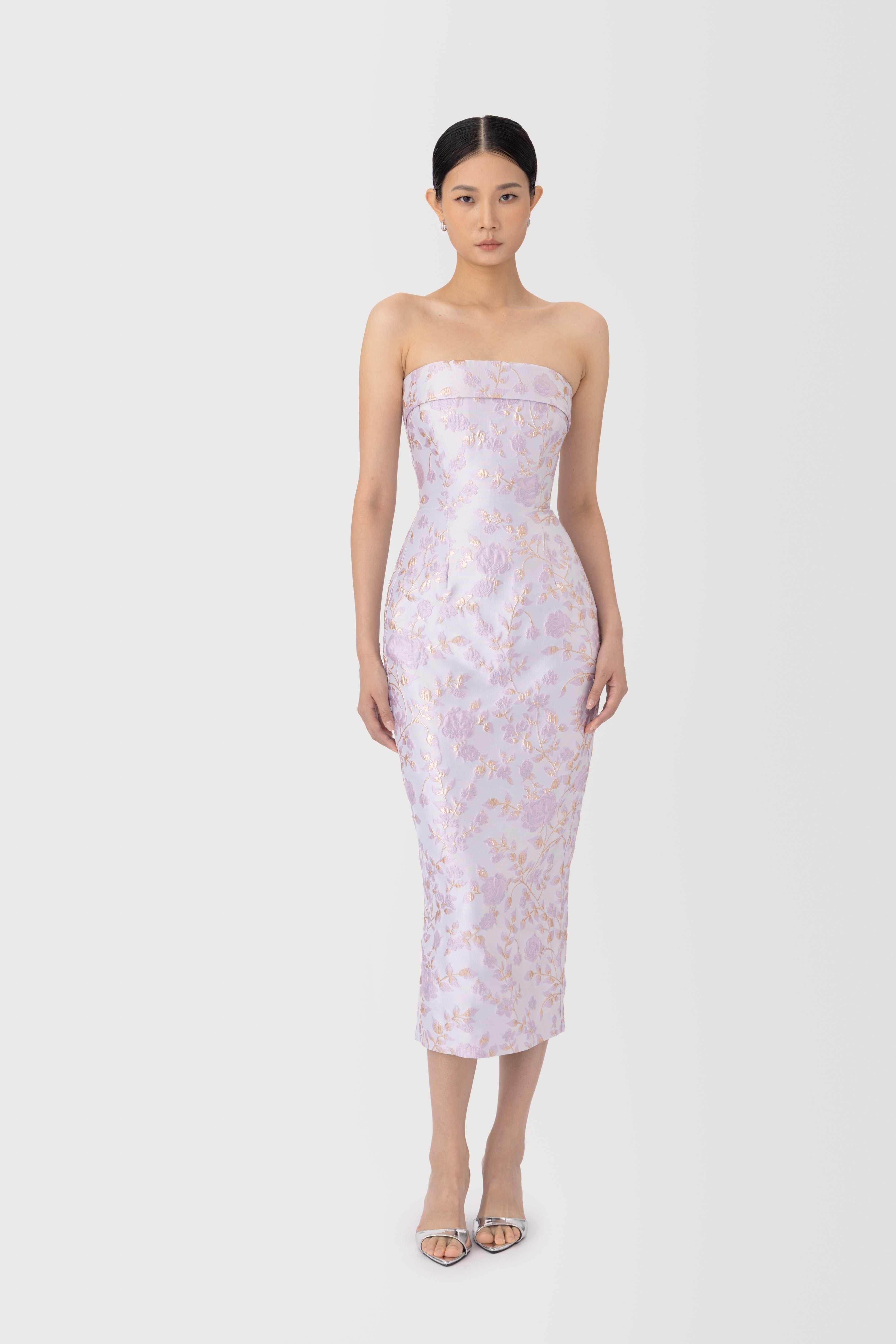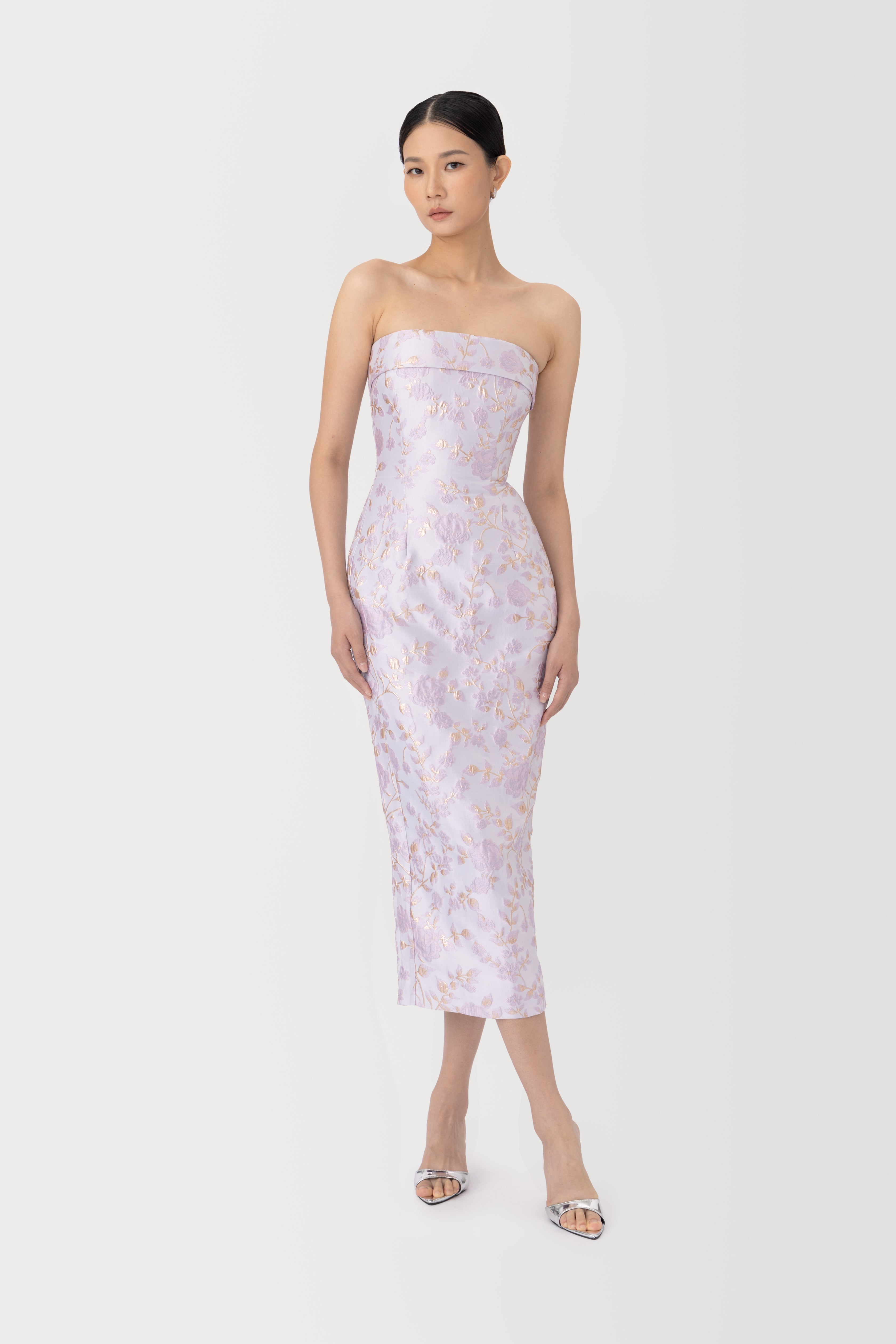 The Judith dress is a midi piece in floral jacquard with a hint of metallic. The lilac floral pattern provides a fresh look, accented a fold-over strapless neckline and a modern back slit.