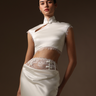 The Lila satin top is crafted from lustrous satin fabric, accented with delicate chantilly lace trim. It features a distinctive cheongsam opening with a mandarin collar for a modern twist, while hand-tied pipa knot details add unique charm to its close-fitting, cropped silhouette. Pair it with the matching Lila satin skirt for a complete look.