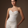 The Lin beaded corset top is crafted from sequin and pearl-beaded fabric. It features a built-in structured corset-style bodice that offers support and shape. The draped sweetheart neckline adds a soft touch, while the exposed zipper provides a modern edge. Perfect for pairing with the Lin crepe pants.