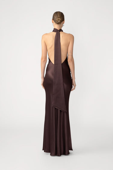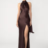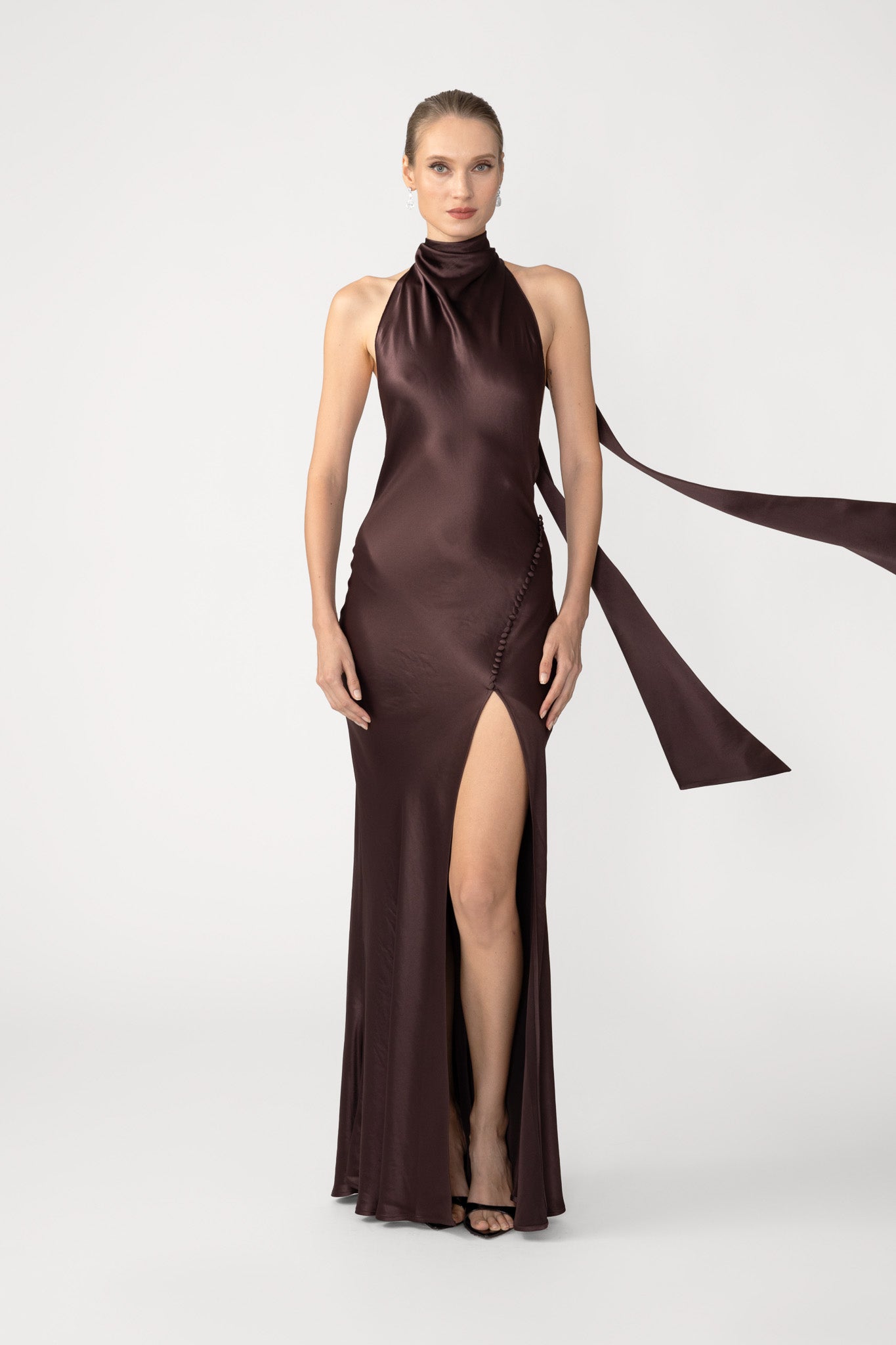Penelope is our top bestseller that is guaranteed to make you feel effortlessly beautiful and captivating. A stunning bias-cut satin gown featuring a high neck, a low-cut back and open sides, a thigh-high side slit with covered button detail at the hip, and large statement wings at the back of the neck.