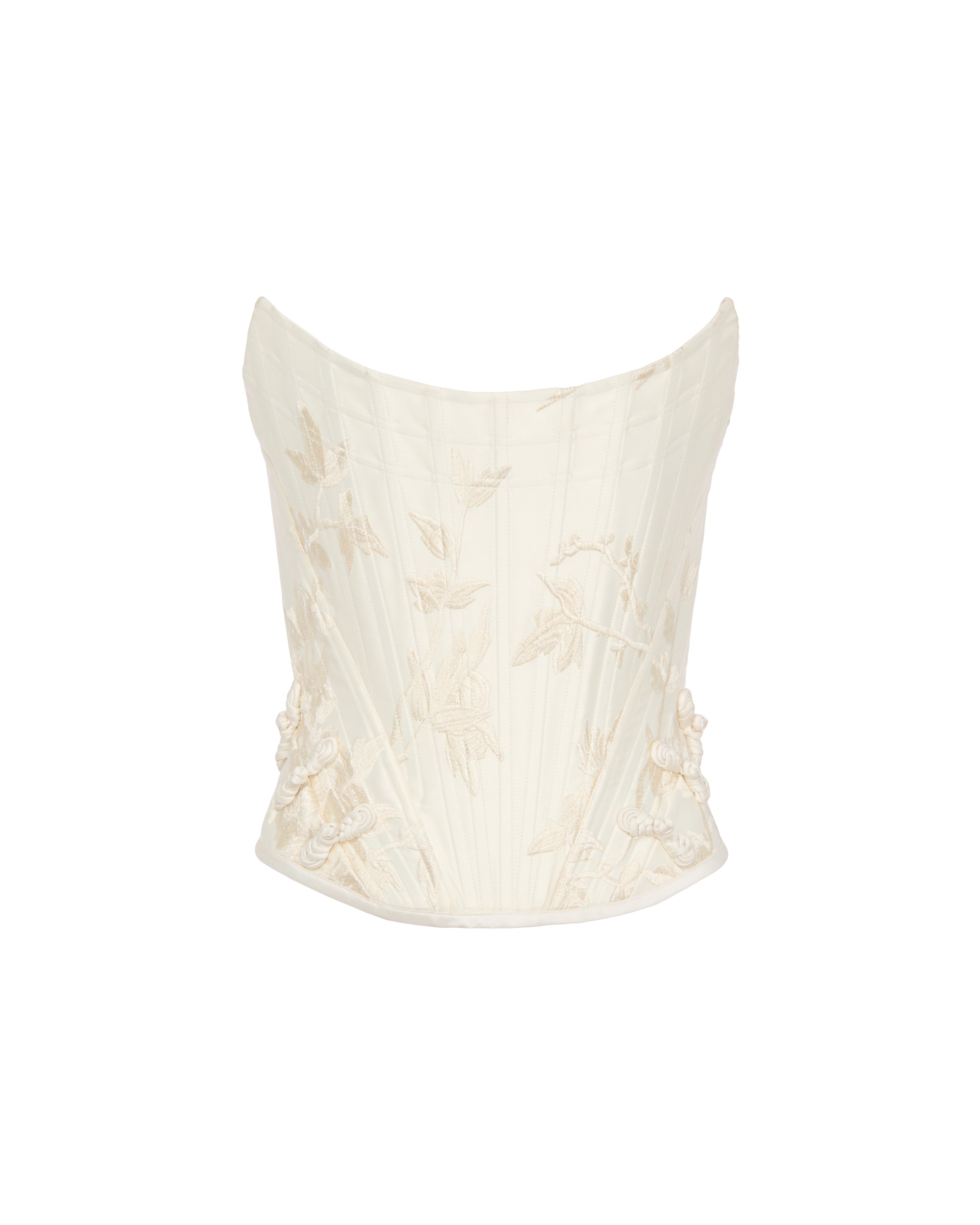 The Sutton embroidered corset top showcases detailed embroidery on luxurious satin, designed with a strapless neckline and corset seams. Exposed boning creates a flattering silhouette, while hand-tied pipa knots and an exposed zipper add distinctive accents. The curved hem completes the modern design, making it the perfect match for the Sutton embroidered skirt.